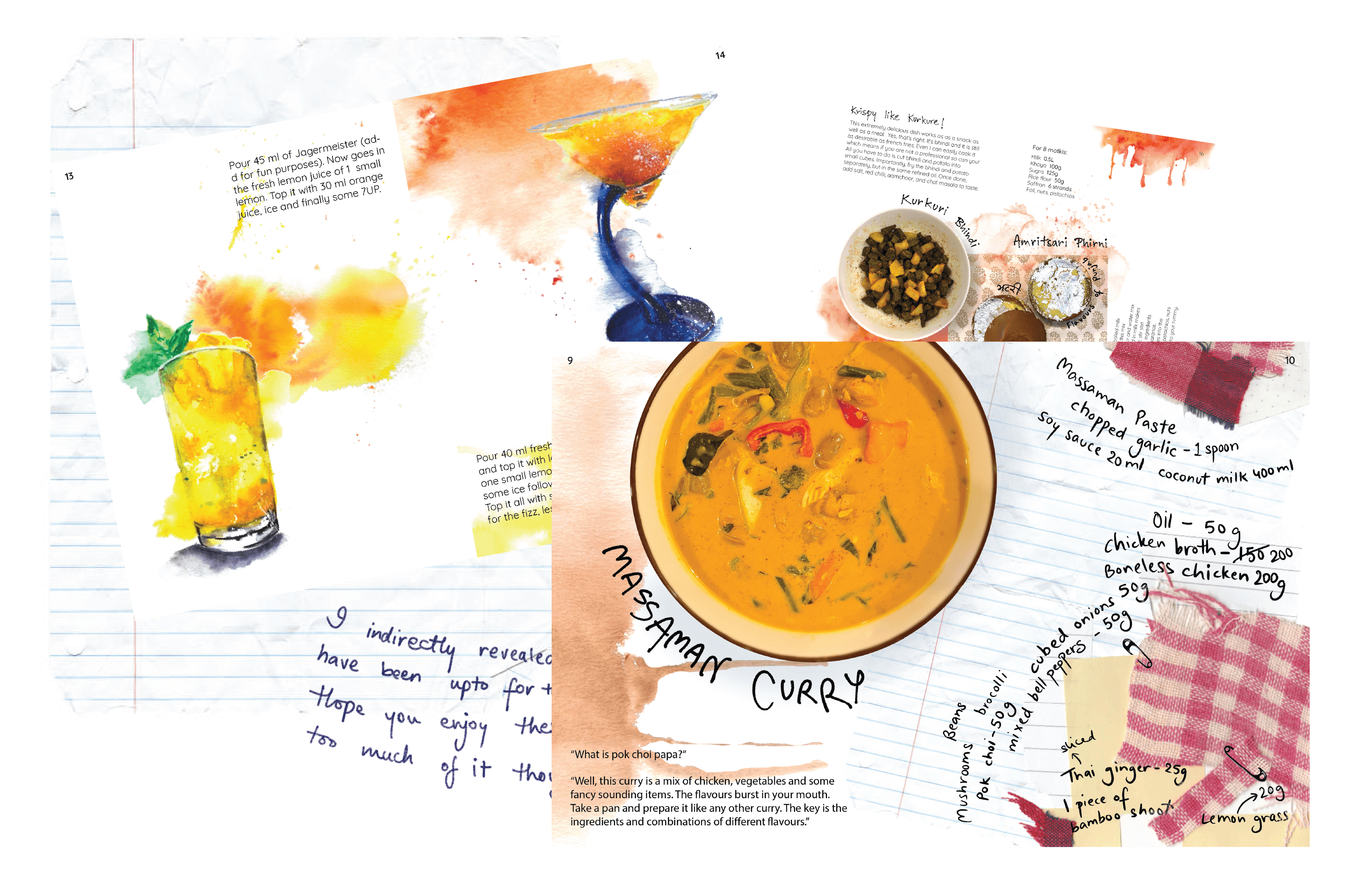 The process began with speaking to family members and gathering recipes that hold meaning to us. I photographed dishes, created watercolor illustrations, and experimented with collages using both photos and hand-painted elements. These were scanned, edited, and then brought together through the final layouts of the cookbook journal.