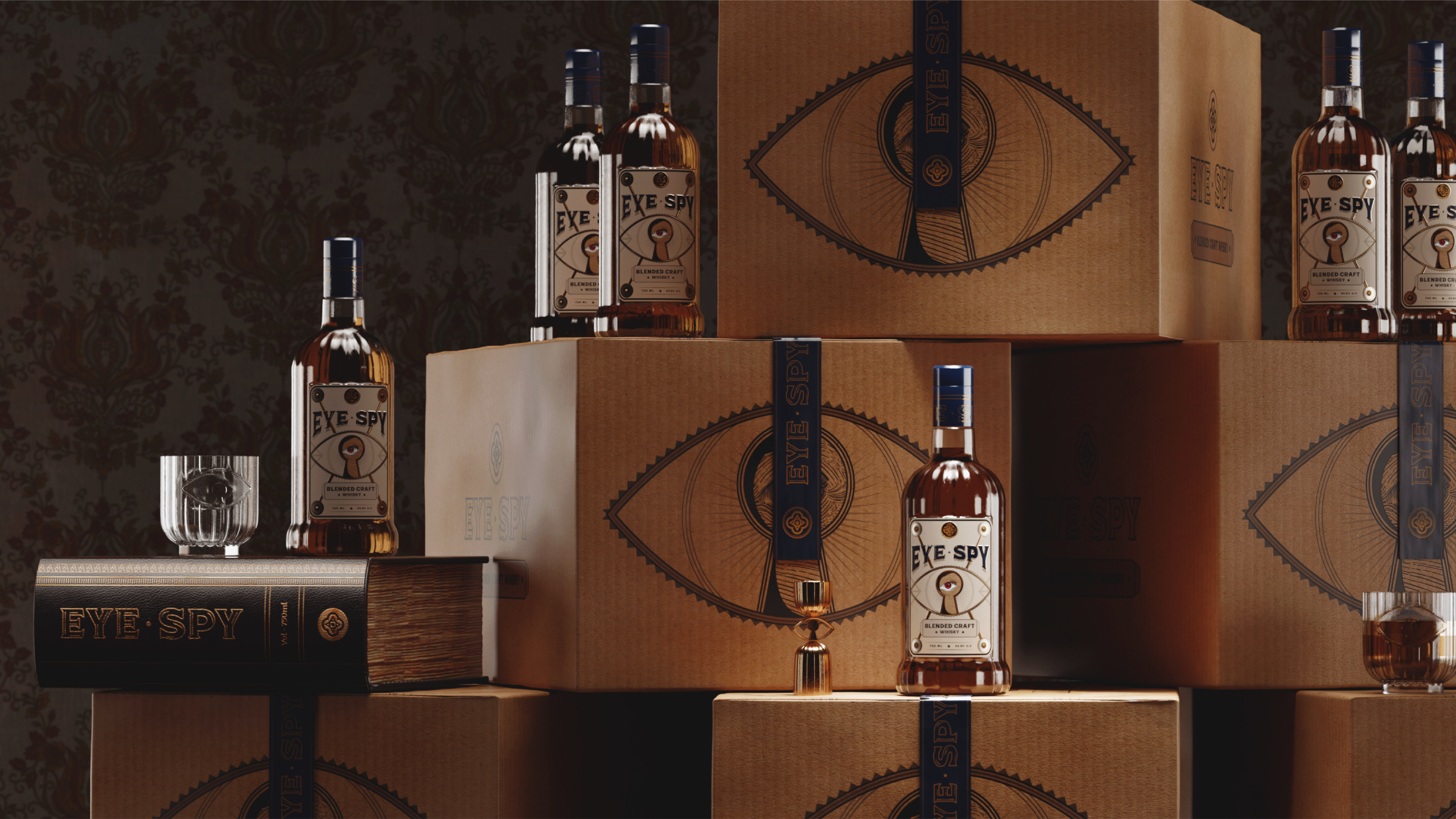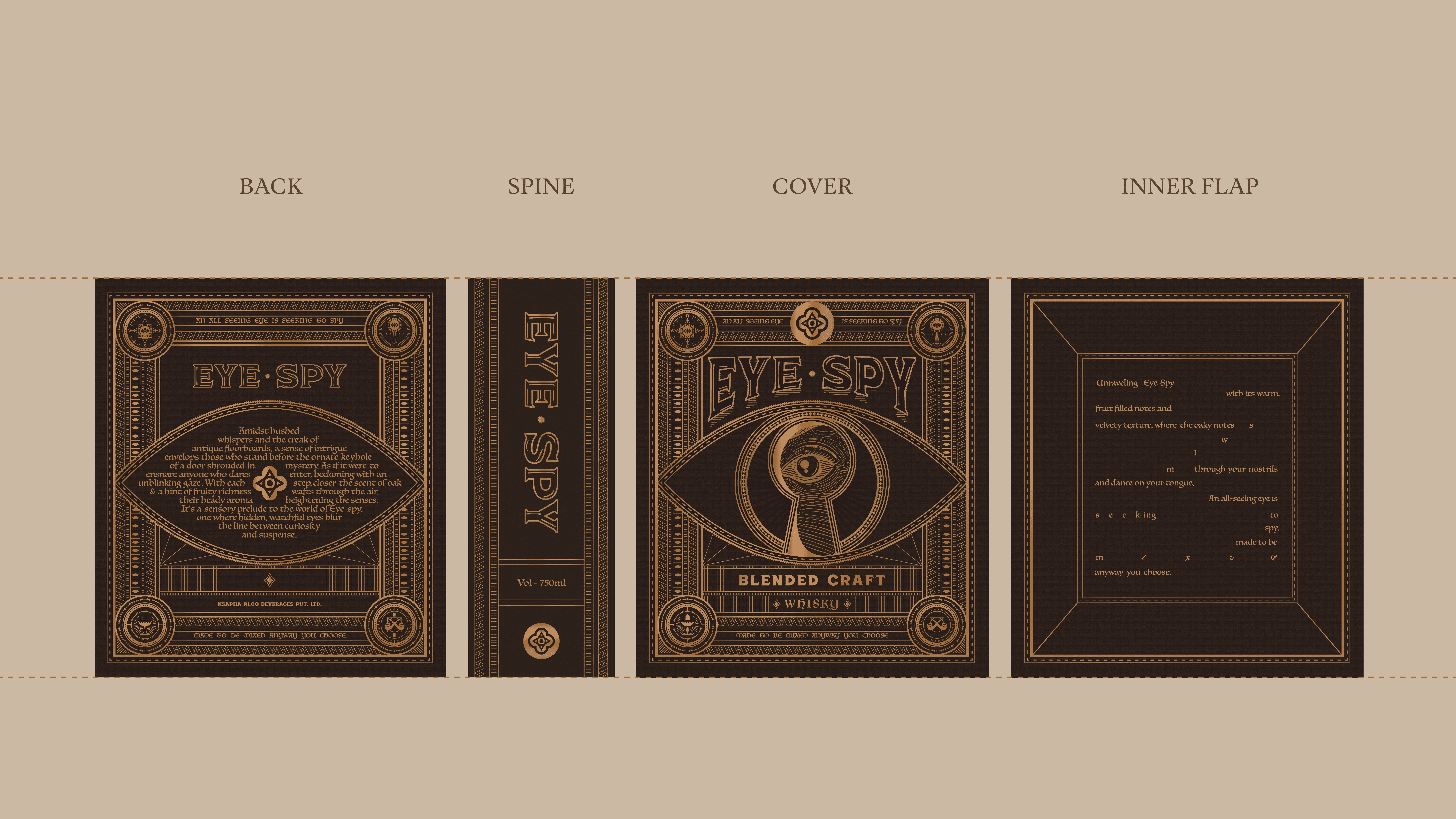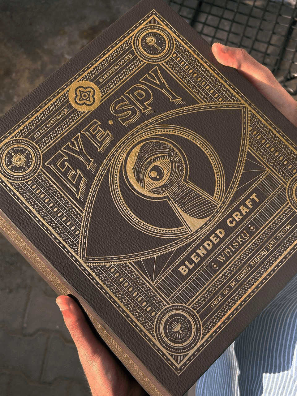 Eye Spy’s visual identity acts as both a product identifier and a storytelling canvas. The premium packaging box uses classic design elements, creating a timeless, book-like aesthetic that produces the allure of a classic novel while showcasing the refined quality within. Carefully crafted text reveals a narrative, inviting consumers.