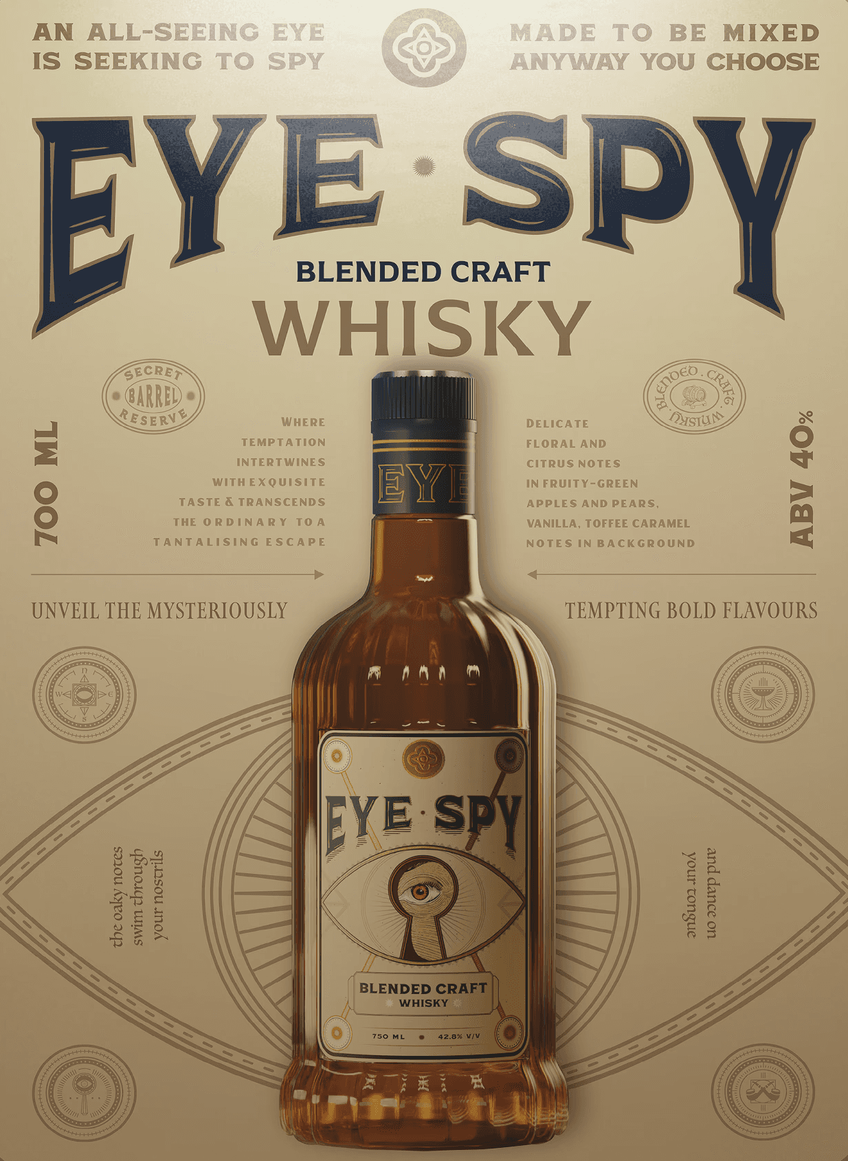 Eye Spy weaves an enchanting tale of mystery and revelation with every carefully crafted dram. The moniker artfully alludes to both keen observation and the unveiling of coveted secrets, inviting the imbiber on a journey of sensory discovery. The concept of the label was inspired by the internal mechanism of a lock with the centre keyhole imagined as a peephole, leveraging stippling design to create a retro eye. The visual cornerstone—an eye with an integrated key—symbolizes the unlocking of the whisky's hidden treasures. It represents the connoisseur's role in unveiling the spirit's intricate complexities, each sip a revelation of profound depth and character.